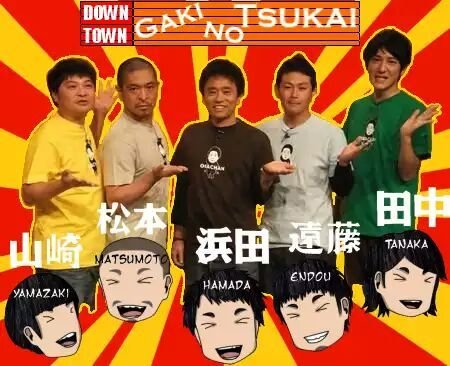 Regular cast Matsumoto Hitoshi 松本人志 and Hamada Masatoshi 浜田雅功 Tsukitei Hōsei 月亭 方正 Cocorico. Tanaka Naoki 田中直樹 and Endō Shōzō.